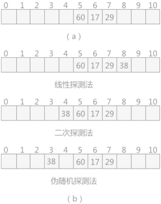 例如,在长度为 11的哈希表中已填写好17、60 和 29 这 3个数据(如图 2(a)所示),其中采用的哈希函数为:H(key)=keyMOD 11,现有第4个数据38,当通过哈希函数求得的哈希地址为5,与60冲突,则分别采用以上3 种方式求得插入位置如图2(b)所示: