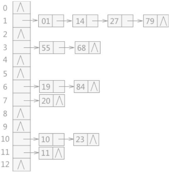 例如有一组关键字{19,14,23,01,68,20,84,27,55,11,10,79},其哈希函数为:H(key)=key MOD 13,使用链地址法所构建的哈希表如图 3 所示: