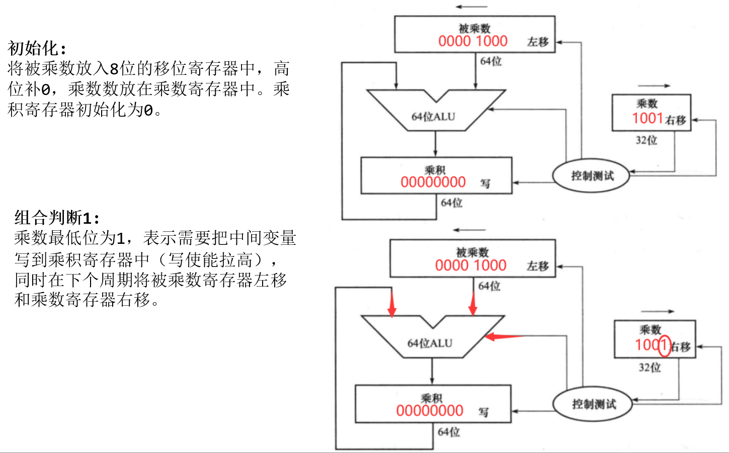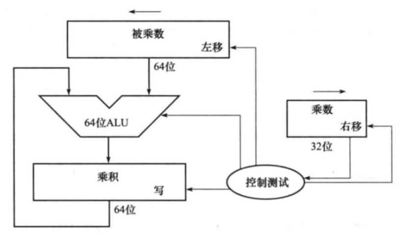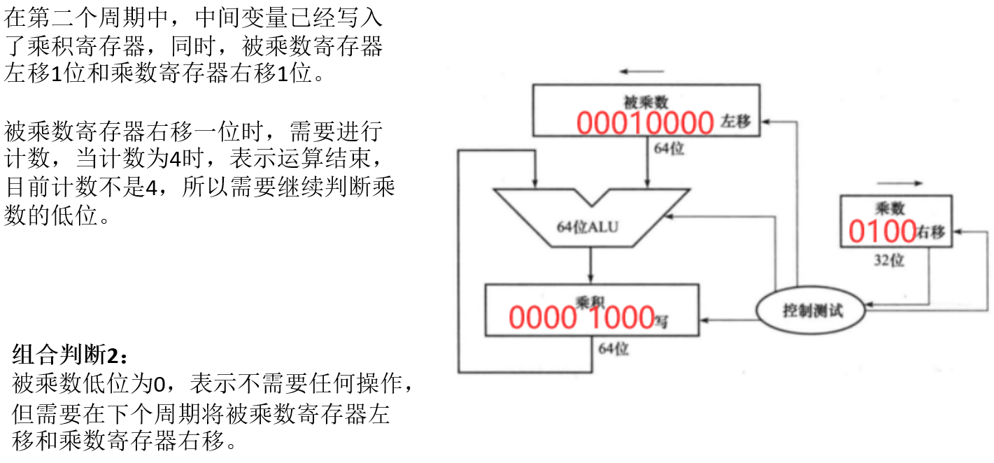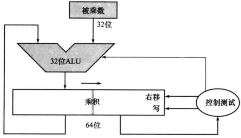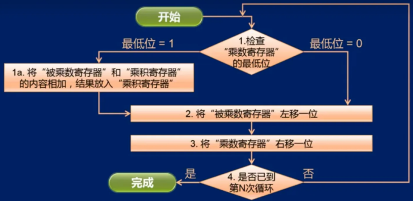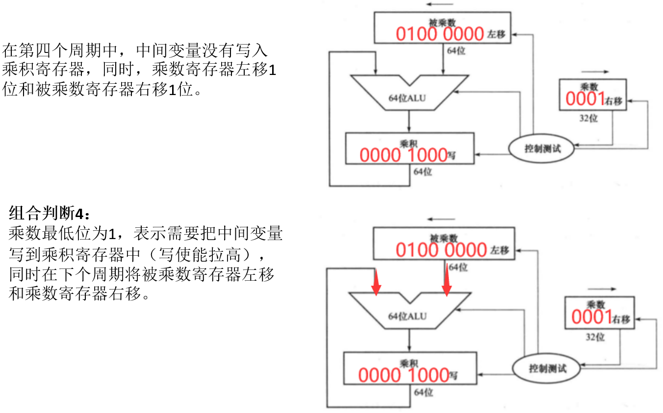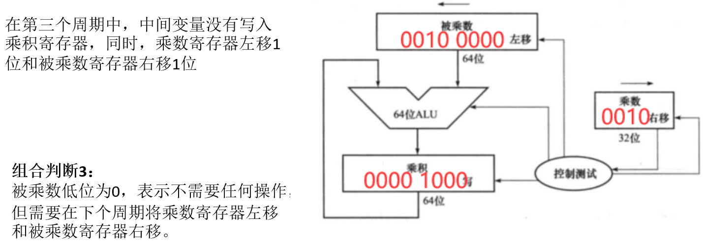 - 如果最低位是1,则将被乘数寄存器的值加到乘积寄存器。