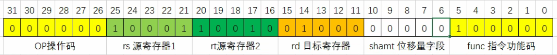 Op: 指令操作码,用于标识指令的类型和功能。6位RS: 第一个源操作数寄存器号,用于存放第一个操作数。5位Rt: 第二个源操作数寄存器号,用于存放第二个操作数。5位Rd: 目标操作数寄存器号,用于存放指令执行的结果。5位Shamt: 位移量字段,用于指定移位指令的位移量。5位Func: 指令功能码,用于选择op操作中的具体函数。6位