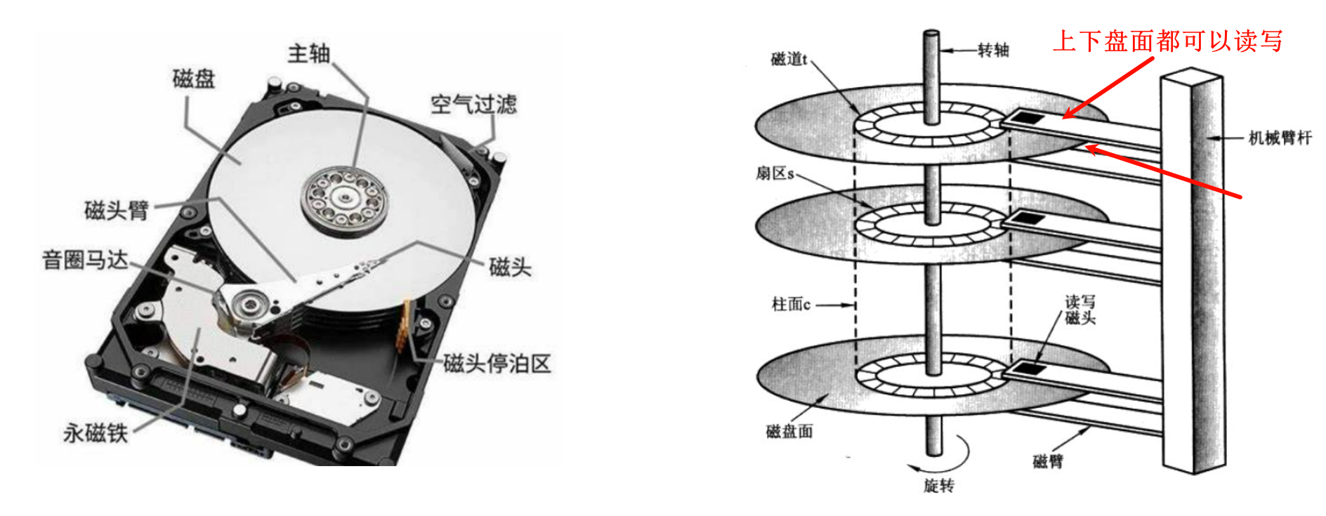 读写磁头: 对于每一层磁盘表面, 都有一个或多个包含小型电磁线圈的读写磁头悬浮在其上方, 极为接近但不接触盘面。磁头通过改变或感应磁场来实现数据的写入和读取。