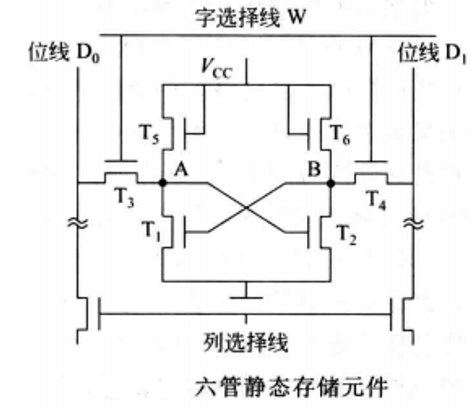 其存储单元是双稳态触发器(六晶体管MOS), 它利用一组晶体管(通常是六个, 形成两个交叉耦合的CMOS反相器)来保存一个二进制位的信息, 形成一个稳定的状态, 即“0”或“1”。这种设计使得SRAM能够在读取时不改变存储内容(非破坏性读出), 也不需要额外的刷新电路, 从而提供了更快的访问速度。