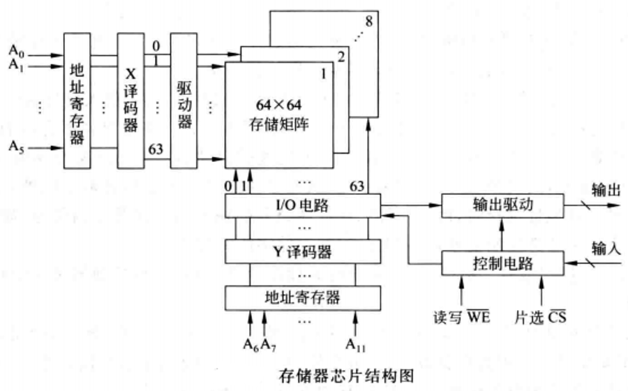 存储阵列有4096个单元(2^12), 需要12根地址线: A0~A11, 其中A0~A5送至X译码器, 有64条译码输出线, 各选择一行行单元; A6~A11送至Y译码器,它也有64条译码输出线, 分别控制一列单元的位线控制门。
