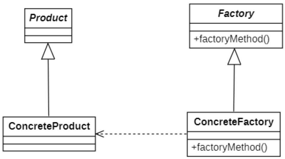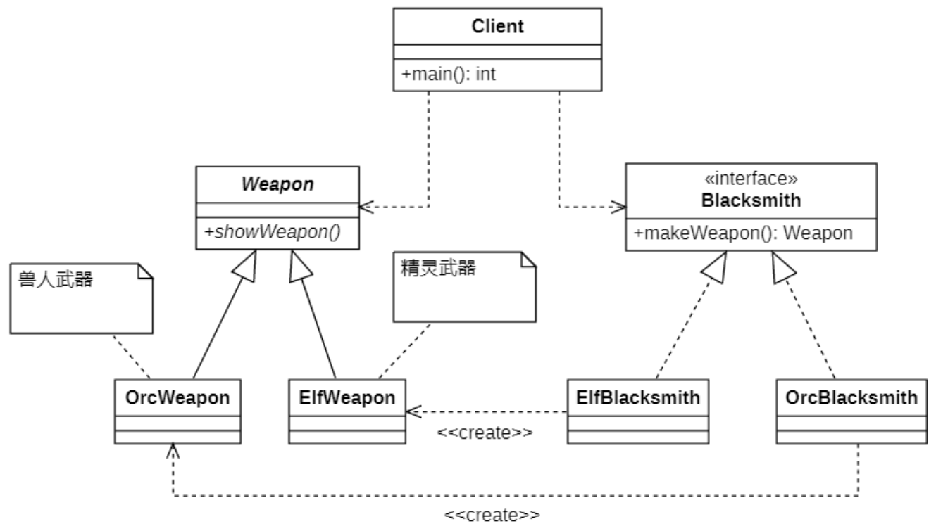 在工厂方法模式中,工厂方法用来创建客户所需要的产品,同时还向客户隐藏了哪种具体产品类将被实例化这一细节,用户只需要关心所需产品对应的工厂,无须关心创建细节,甚至无须知道具体产品类的类名(只需要知道工厂的类名)。