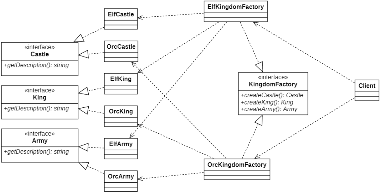 要创建一个王国,我们需要具有共同组织的对象。精灵王国需要一个精灵国王,精灵城堡和精灵军队,而兽人王国需要一个兽人国王,兽人城堡和兽人军队。王国中的对象之间存在依赖关系。