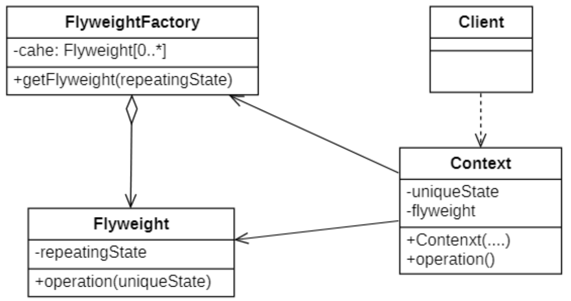 - Flyweight Factory (享元工厂): 会对已有享元的缓存池进行管理。有了工厂后,客户端就无需直接创建享元,它们只需调用工厂并向其传递目标享元的一些内在状态即可。工厂会根据参数在之前已创建的享元中进行查找,如果找到满足条件的享元就将其返回;如果没有找到就根据参数新建享元。