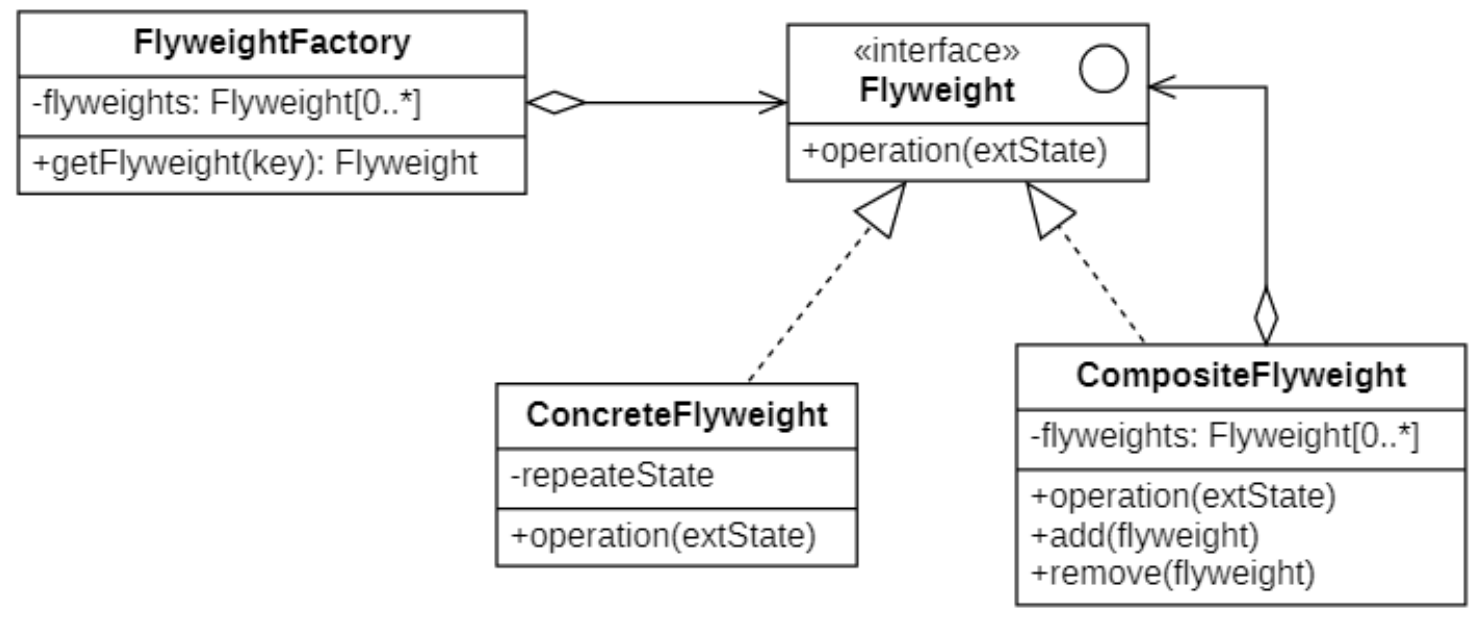 Wikipedia says: A flyweight is an object that minimizes memory use by sharing as much data as possible with other similar objects; it is a way to use objects in large numbers when a simple repeated representation would use an unacceptable amount of memory.享元是一种通过与其他类似对象共享尽可能多的数据来最小化内存使用的对象;当简单的重复表示将使用不可接受的内存量时,这是一种使用大量对象的方法。