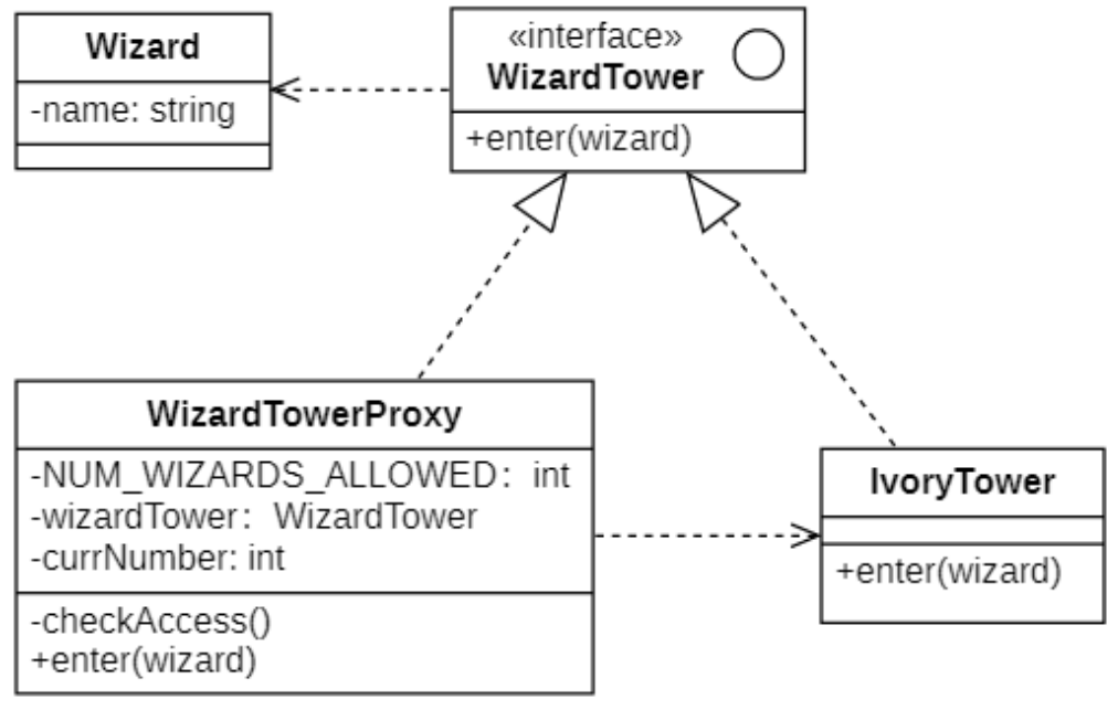 一开始设计了抽象类巫师塔, 但到了后来发现巫师塔人太多了不行, 需要一个限制条件, 塔满则不能进入. 现使用代理模式来实现, 通过构造注入一个 具体的巫师塔...