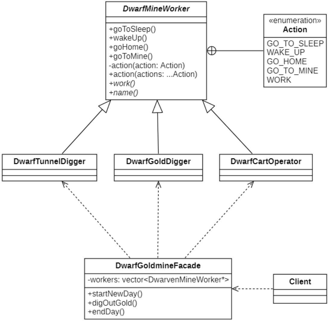 下面是一个矮人挖金矿的过程,使用Facade模式来演示其流程