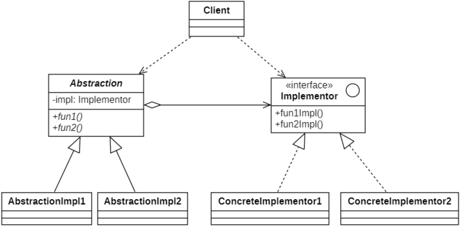Wikipediasays: The bridge pattern is a design pattern used in software engineering that is meant to "decouple an abstraction from its implementation so that the two can vary independently"桥接模式是软件工程中使用的一种设计模式,旨在 “将抽象与其实现分离,以便两者可以独立变化”