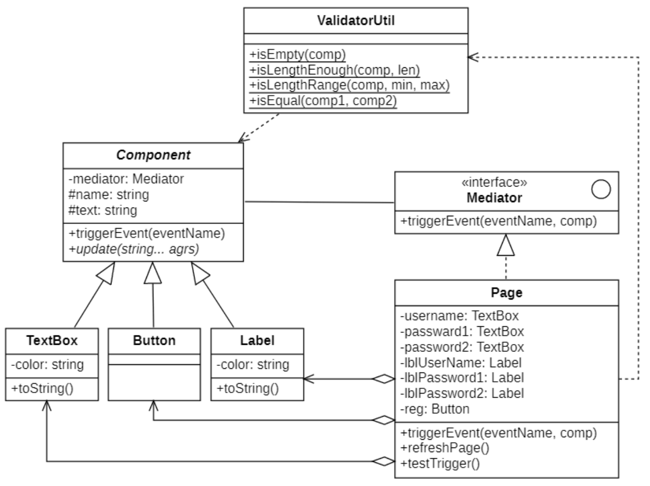 Wikipedia says: The mediator pattern defines an object that encapsulates how a set of objects interact. With the mediator pattern, communication between objects is encapsulated within a mediator object. Objects no longer communicate directly with each other, but instead communicate through the mediator. This reduces the dependencies between communicating objects, thereby reducing coupling.中介模式定义了一个对象,该对象封装了一组对象如何交互。使用中介模式,对象之间的通信被封装在中介对象中。对象不再直接相互通信,而是通过中介器进行通信。这减少了通信对象之间的依赖性,从而减少了耦合。