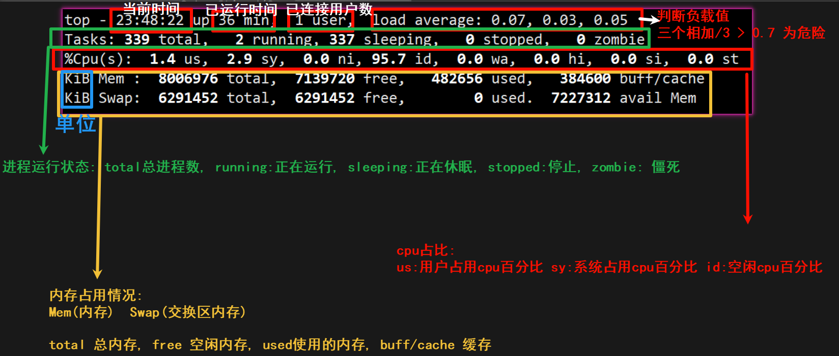 top - 23:47:58 up 36 min, 1 user, load average: 0.01, 0.02, 0.05