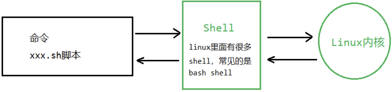 Shell 是一个命令行解释器,它为用户提供了一个向 Linux 内核发送请求以便运行程序的界面系统级程序,用户可以用 Shell 来启动、挂起、停止甚至是编写一些程序。下面我们用一幅图来解释什么是shell。